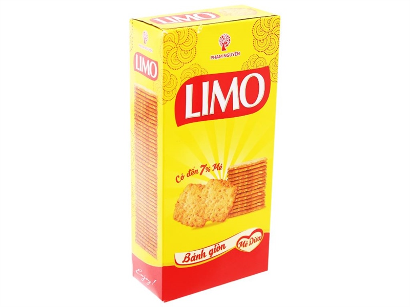 LoạiBánh quy giòn mè dừaKhối lượng240gThành phầnBột mì, bột bắp, đường, chất béo thực vật, mạch nha, bơ, bột sữa, mè(7%), dừa sấy, muối, chất điều chỉnh độ acidBảo quảnĐể nơi khô ráo, thoáng mát, tránh ánh nắng trực tiếpThương hiệuLimo (Việt Nam)Nơi sản xuấtViệt Nam